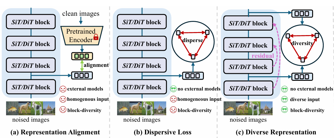 We propose DiverseDiT, a novel and efficient framework explicitly designed to enhance representation diversity with long residual connections to diversify input and represen tation diversity loss to encourage distinct features across blocks, without relying on external guidance.