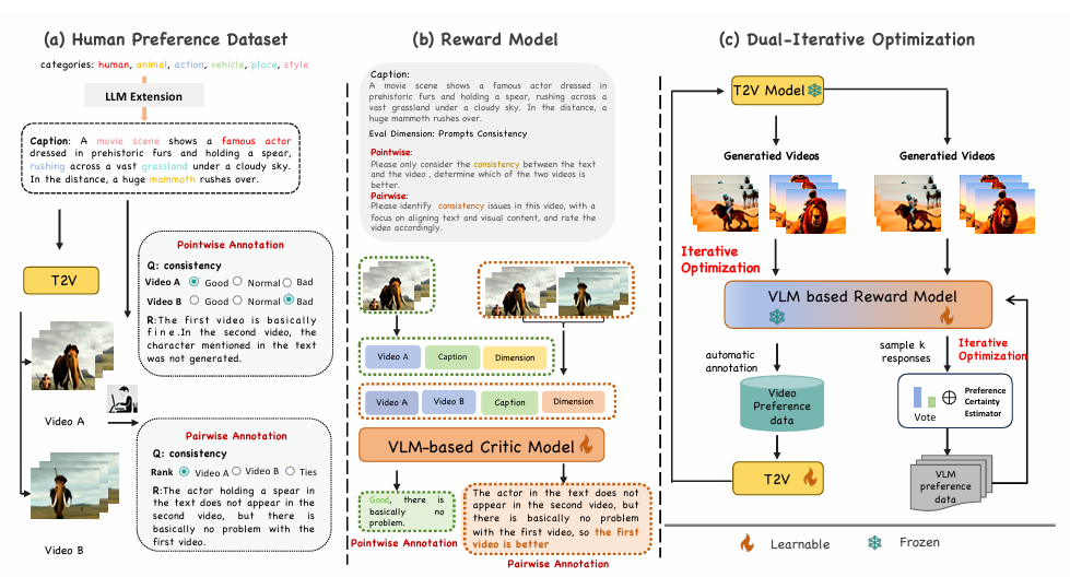We introduce Dual-Iterative Optimiza tion (Dual-IPO), an iterative paradigm that sequentially optimizes both the reward model and the video generation model for improved synthesis quality and human preference alignment. For the reward model, our framework ensures reliable and robust reward signals via CoT-guided reasoning, voting-based self-consistency, and preference certainty estimation.